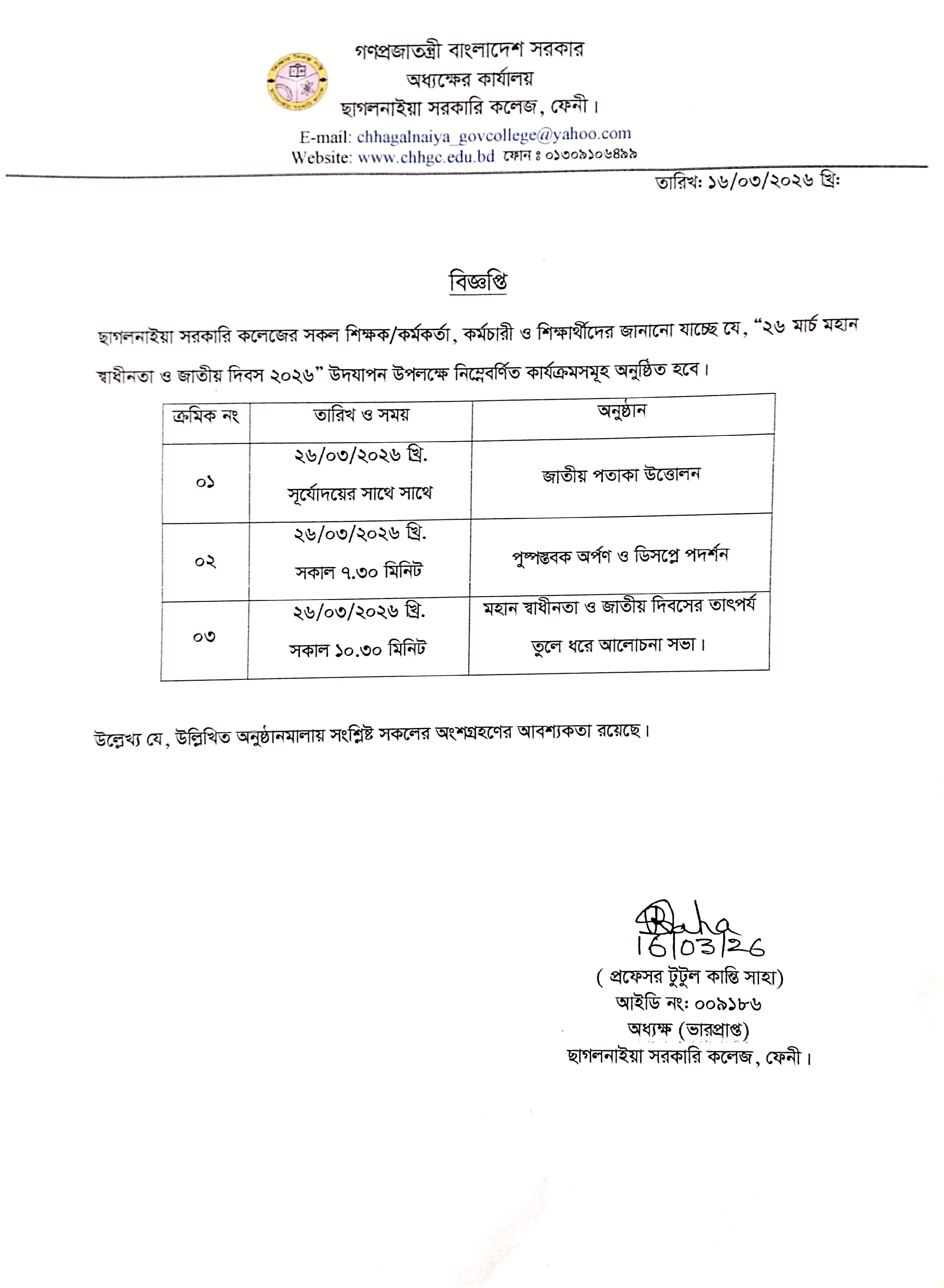 - "২৬ মার্চ মহান স্বাধীনতা ও জাতীয় দিবস ২০২৬" উদযাপন।